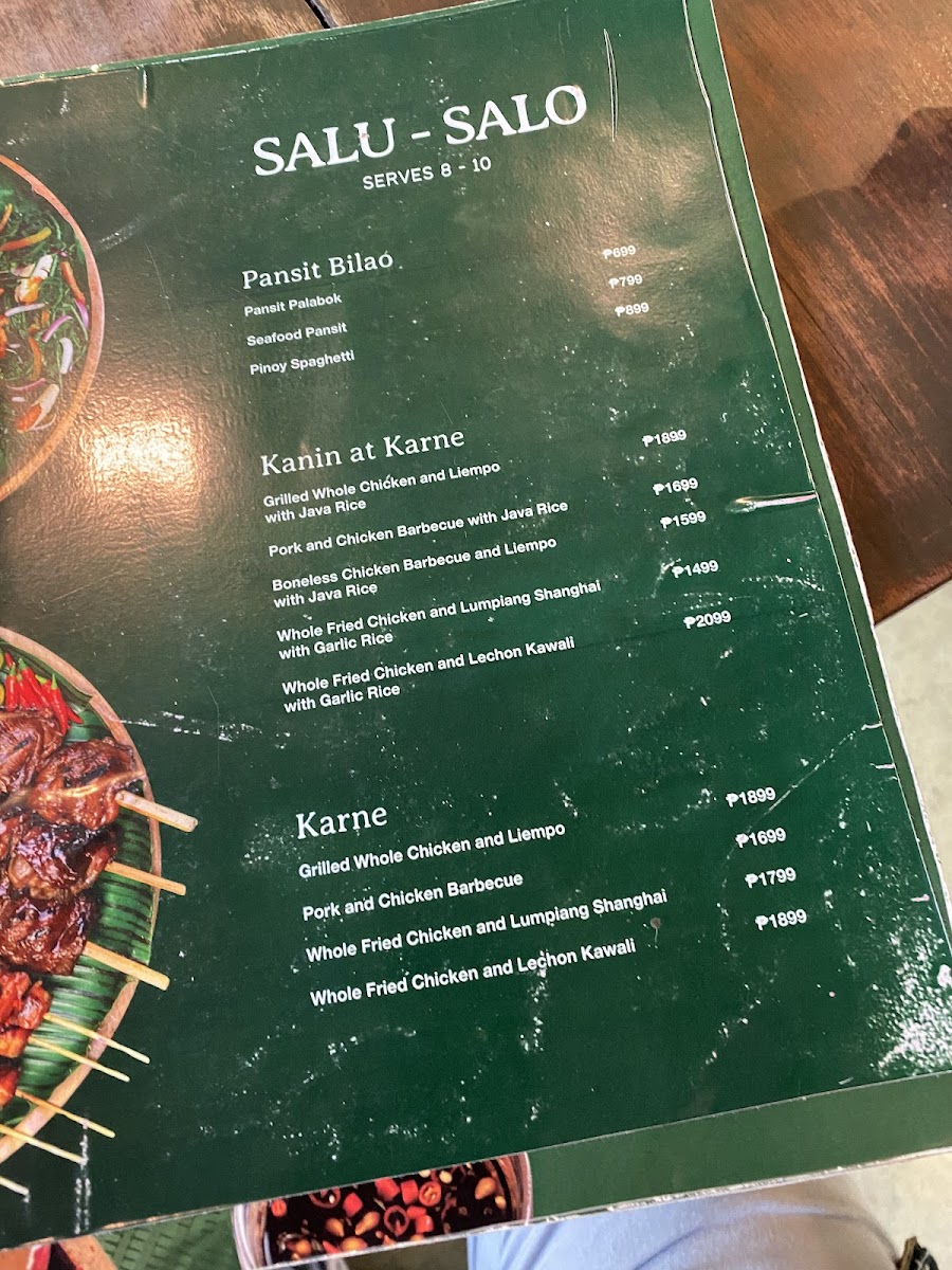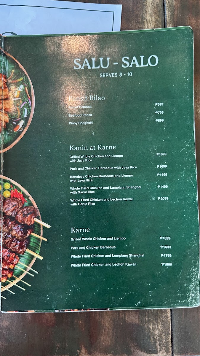 The menu offers a variety of food and beverage options organized into several key categories. For savory dishes, there are traditional Filipino meals such as set meals featuring pork barbecue, Bicol Express, boneless chicken quarters, and the Java Rice Platter. Larger group servings are available with offerings like Pansit Palabok Bilao and Seafood Pansit Bilao, designed to serve 8 to 10 persons.